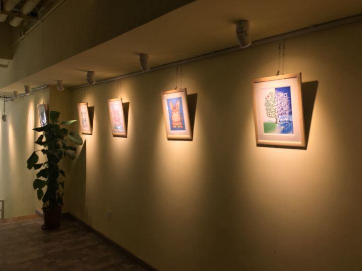 等上菜的空余时间,可以走上二楼选一本好书,意犹未尽则掏出钱包买回家,心里庆幸又收获一本好书。从二楼准备下来,谁知又发现惊喜,走廊上挂满逗趣独特的“二维码”绘画作品。原来,每一幅画里都暗藏二维码,只需往画作一扫,即能扫出作者联系方式。不论是想要买画或是和作者交流,都不成问题。