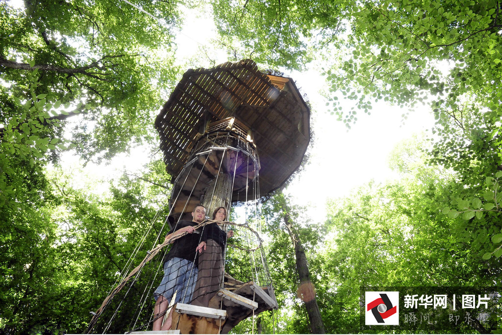 2009年7月25日,法国西部维埃纳,美丽公园提供的旅游项目——树上旅馆。到这里来的游人可以在14个建在树上的小屋居住。这些小屋大小不一,有单人间也就家庭套房,都位于离地面5到14米的高处。屋里没有自来水,但是有厕所。当然也不能指望有电梯了,你可以利用绳梯或者从木制旋转楼梯爬上去。