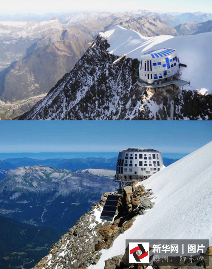 2012年8月6日消息(具体拍摄时间不详),法国圣热尔维,一座坐落在阿尔卑斯山脉上海拔3835米的旅馆近日落成,旅馆目前处于试运行状态直到8月底向公众开放。这座旅馆共有120个床位,达到了高环境质量标准。