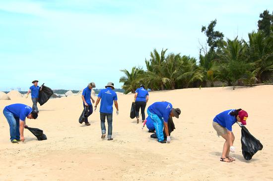 中国海南,文昌 - 2016年6月8日 - 文昌鲁能希尔顿酒店蓝色能量委员会携手“印象文昌志愿者协会”在淇水湾举行沙滩清洁活动,旨在响应世界海洋日“关注海洋健康,守护为蓝星球”的号召。共有近30名志愿者参与沙滩清洁活动,共清得垃圾20.6公斤。
