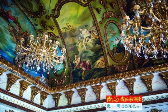 酒店大堂是通往空中花园的必经之路,酒店大堂的穹顶以文艺复兴风格的油画覆盖,黄河山强调那是手工画的,而吊顶水晶灯则出自他经营的灯饰厂。