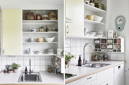 碗橱也收拾得整整齐齐,最具特色的是打造成整体式的调料盒,每一个不同大小的格子里放着各种各样的调料,独具匠心的设计。