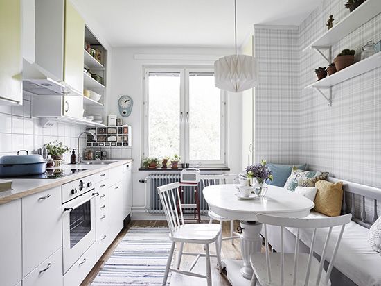 厨房和餐厅位于同一空间,餐厅部分的墙面贴着浅色的格纹壁纸,同时根据空间形状定制了沙发,完全不一样的就餐环境,显得格外温馨。