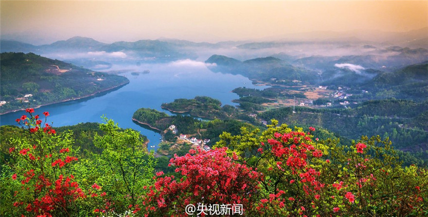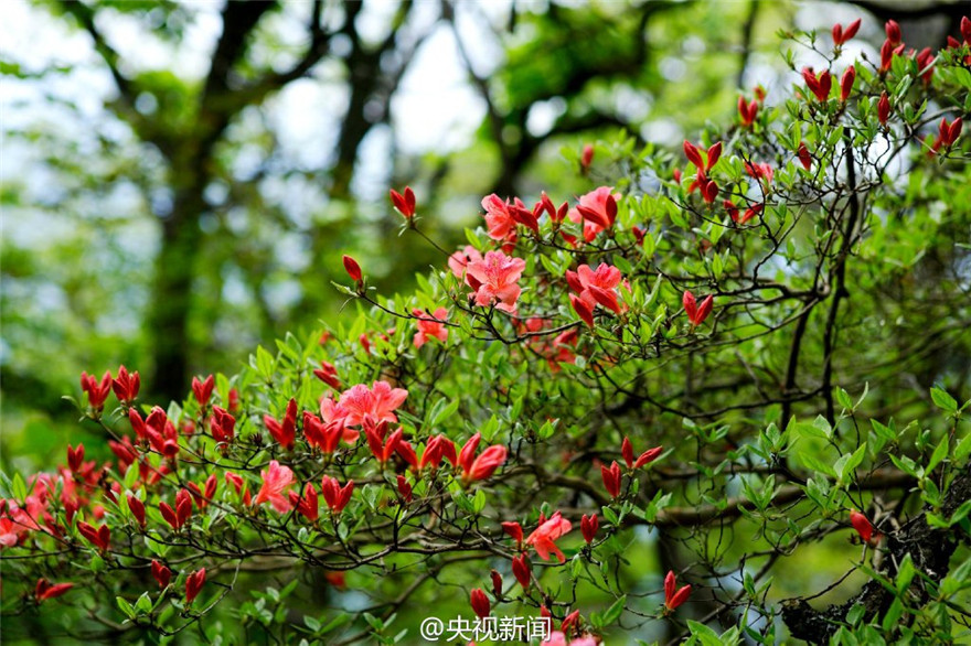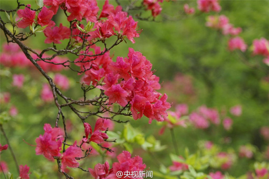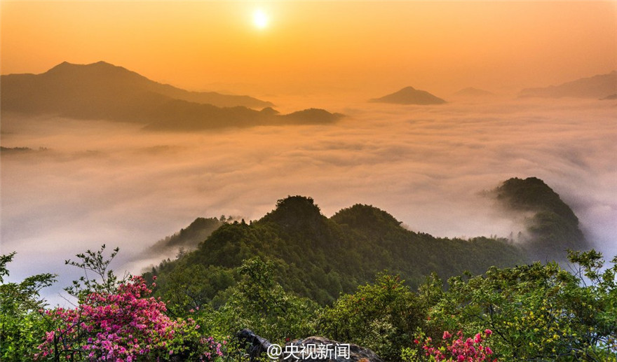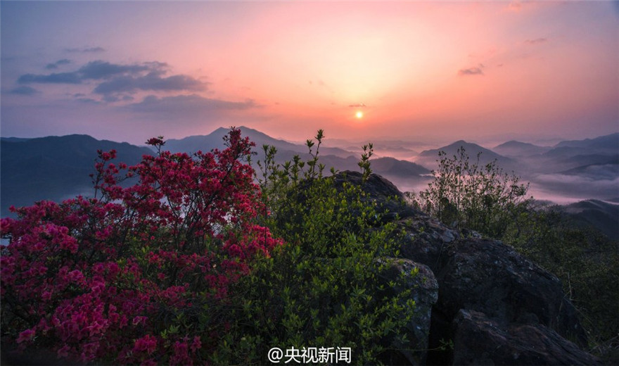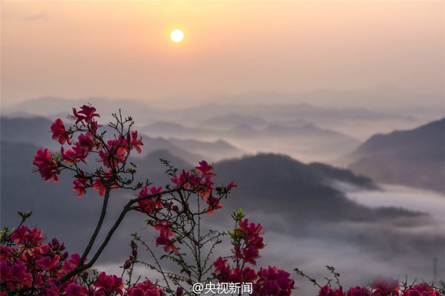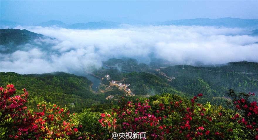 近日,大别山革命老区安徽霍山县,杜鹃花开满山岭。棵连棵、枝连枝,连成花海,如朵朵红云,似灼灼火焰。杜鹃花在当地海拔1000多米的"屋脊山"上,长年云雾缭绕,漫山盛开的杜鹃在变幻莫测的云海映衬下,宛如仙境,美不胜收。