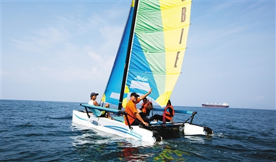 游客乘坐帆船在三亚附近海域游玩。本报记者武威摄