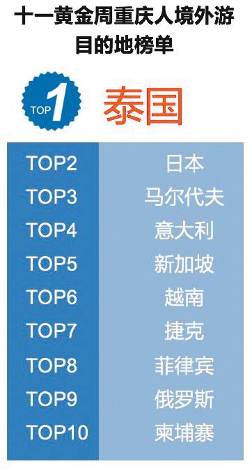 《报告》显示,重庆市民出游十大出境目的地为:泰国、日本、马尔代夫、意大利、新加坡、越南、捷克、菲律宾、俄罗斯、柬埔寨。
