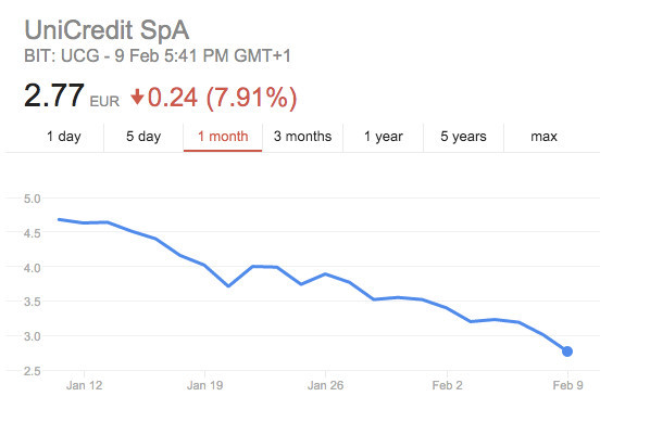 意大利银行及该国决策者坚称,投资者不应对欧洲央行的调查感到担忧。然而,自今年年初,联合信贷(UniCredit)股价已暴跌43%,而同时联合圣保罗银行(Intesa Sanpaolo)股价也大跌了28%。