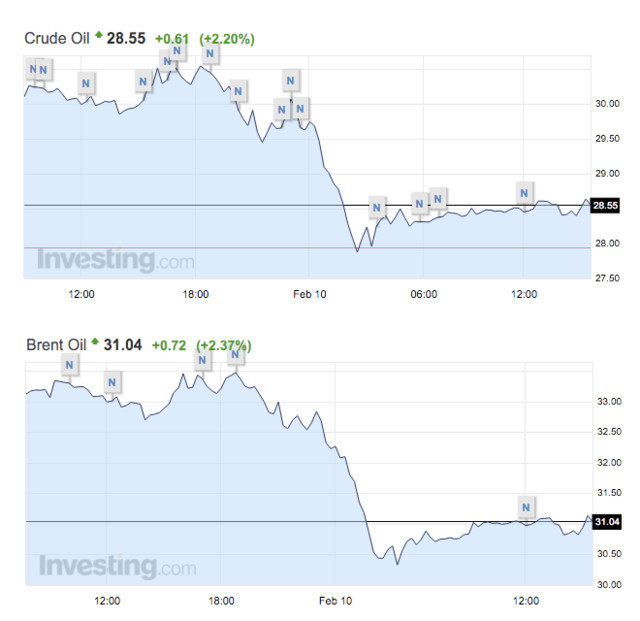 WTI原油已跌破30美元/桶下方,而布伦特原油则在31美元/桶附近。