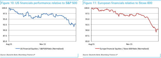 根据德银,尽管美联储加息本应提振美国银行(12.31, 0.04, 0.33%)业,但自去年8月以来,美国金融板块跑输标普500指数7.5个百分点。欧洲银行股更是跑输STOXX 600指数10个百分点。