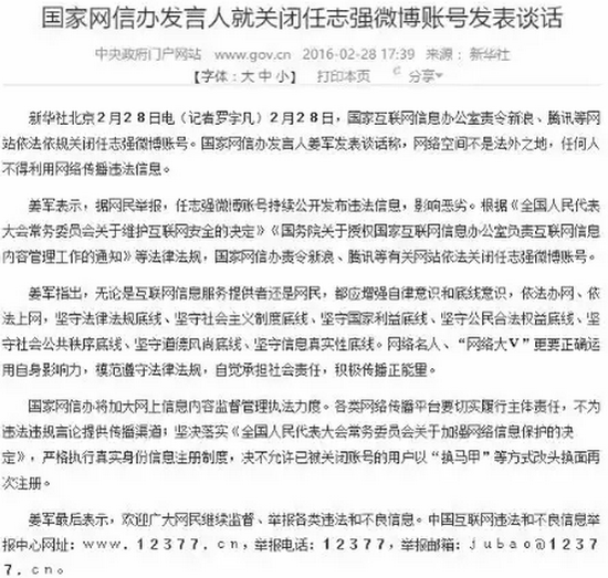 2月28日,国家互联网信息办公室责令新浪、腾讯等网站关闭任志强微博账号。国家网信办发言人表示,据网民举报,任志强微博账号持续公开发布违法信息,影响恶劣。并称,网络名人、“网络大V”更要正确运用自身影响力,模范遵守法律法规,自觉承担社会责任,积极传播正能量。