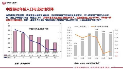 那么,为什么中国经济增速下行了呢?其中一个较为主要的影响因素是人口:人口老龄化、流动性下降、劳动年龄人口数量减少,这是根本原因。人口变化恰好和我国GDP增速下行时间一致,都发生在2011年。这一年,中国新增外出农民工数量首次出现下降,之后持续下降,至2016年只有50余万人。