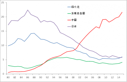 中国、日本、四小龙、东南亚各国对美出口份额的变化