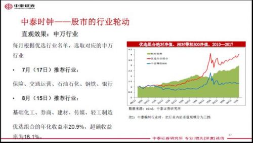 今年7月,中泰研究所推荐了保险、交通运营、石油石化、钢铁、银行五大行业组合,该组合涨幅超越了指数涨幅。8月,我们又推荐了基础化工、券商、建材、传媒、轻工制造,更是明显跑赢指数。因此,我们当前所做的中泰时钟分析方法确实能够提供有效的资产配置方案,当然,中泰时钟的开发及应用时间还较短,需要进一步细化和完善。如接下来我们开始进一步细化资产配置方案,做基于股市二级子行业的资产配置的中泰时钟。