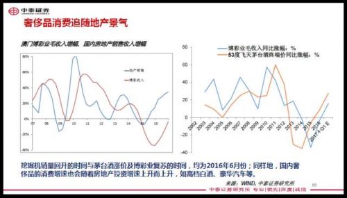 从历史数据对比来看,澳门博彩业毛收入涨幅和国内地产销售收入增长有明显相关性,即销售收入的增长领先于博彩业毛收入的增长。就拿7月份来讲,澳门博彩业毛收入增长了29%,从挖掘机销量增速上升和茅台酒价格上涨,到澳门博彩业毛收入增速见底回升,都发生在去年6月。这张图是博彩业毛收入增速和茅台终端价格涨幅的走势图,可以看到两者也存在明显的相关性。