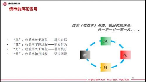 债券的“中泰时钟”的表述更为形象,就是把债券收益率变化分为四个阶段,即风、花、月、雪。,债券收益率处在较高位的时候,我们定义为“风”,可以分步建仓;收益率下降的过程,我们定义为“花”,可以大幅增持;收益率处在低位时,我们定义为“月”,需要谨慎,不再增持;收益率再抬升的时候,我们称为“雪”,应该大幅减仓。所以,债券的资产配置依据,就是风、花、月、雪四个阶段。我们认为,现在处于“风”的阶段,也就是收益率相对高位的时候,债券收益率很难进一步上行,可以分步建仓。
