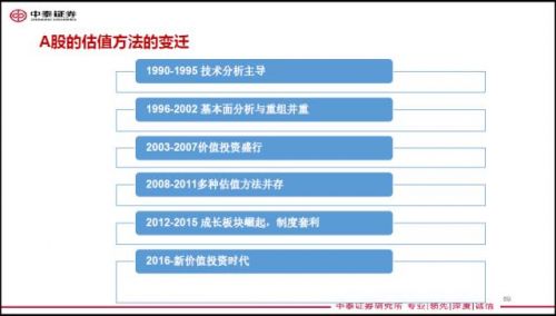 回顾1990年至今A股估值历史,可以发现A股市场估值方法也在不断演进。1990-1995年,投资者只搞技术分析,大家都没有分析师从业资格,也不去上市公司调研;1996-2002年,基本面分析较多,研究员会去上市公司调研,但A股已经进入资产重组时代;2003年,进入价值投资时代。价值投资理念为何在这个时候被广泛接受呢?