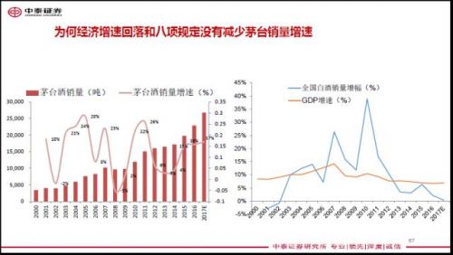 如何解释这一现象呢?因为基建投资和房地产投资的火爆,更有利于高收入群体收入的增长,而GDP增速与中低收入群体的收入增速更具有相关性。我又做了一张图,发现这一轮投资拉动经济增长的模式和上一轮不同之处在于,2009年推出的四万亿投资拉动了全民收入的大幅增长,导致2010年白酒销量增长了近39%,其中茅台销量增加26%,同时猪肉价格也出现大幅上涨(白酒与猪肉销量代表普通民众消费水平的变化情况);而这一轮经济拉动中,白酒销量几乎零增长,猪肉价格回落,但茅台的销量奇迹般增长了17%。尽管八项规定会影响到茅台销量的增速,但实际上并没有有效遏制住茅台的涨势。