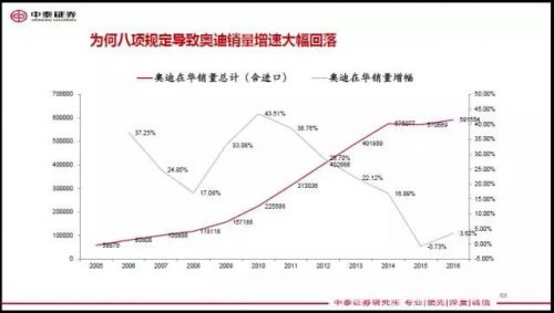 不过,八项规定却有效抑制了奥迪销量的增速,这张是奥迪销量增速大幅回落的图。两者增速差异的背后是什么原因呢?大家可以去思考一下。我们选择消费股的时候要有深层考虑:茅台酒除了有消费功能,还有储藏升值的投资功能;奥迪车在八项规定出来之前,具有身份象征功能,而现在,既无投资功能,又失去了“官车”的代表意义。