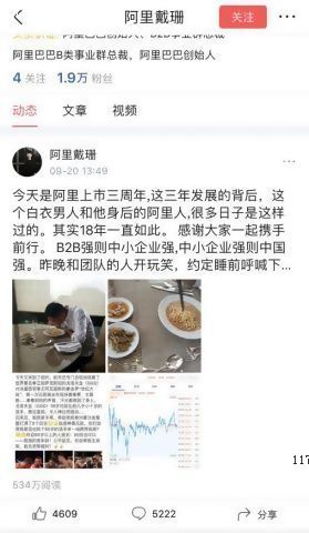 这则微头条发布于9月20日,是阿里上市三周年的日子。“今天是阿里上市三周年,这三年发展的背后,这个白衣男人和他身后的阿里人,很多日子是这样过的。其实18年一直如此。感谢大家一起携手前行。”