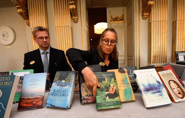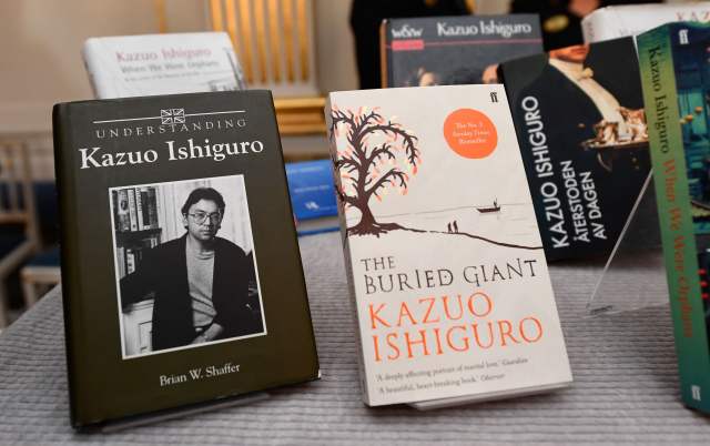 这是10月5日在瑞典首都斯德哥尔摩瑞典文学院拍摄的石黑一雄的代表作品和介绍石黑一雄的书籍。(新华/法新)