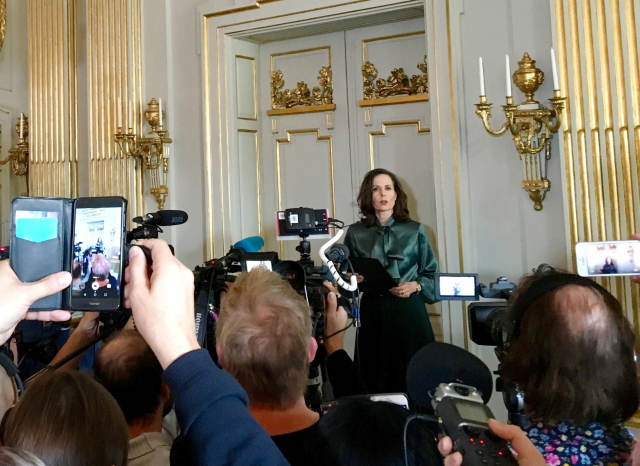 10月5日,在瑞典首都斯德哥尔摩,瑞典文学院常任秘书萨拉·达尼乌斯在新闻发布会上公布诺贝尔文学奖获得者。(新华/法新)