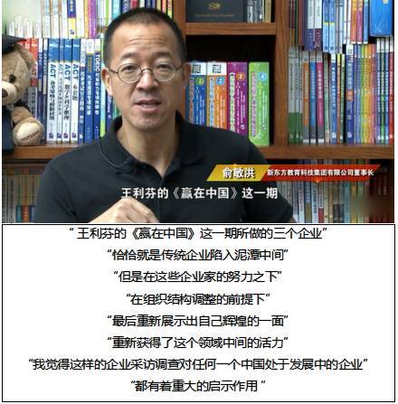 今年,王利芬老师率领节目组打造新版《赢在中国》,深入中国商业实战一线,从不同领域精选了三家企业,他们在激烈的市场角逐中,运用竞争战略,跳出同质化竞争,摆脱价格血战,取得了阶段性成功。