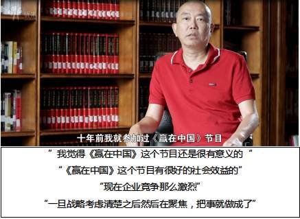 新版《赢在中国》共三集,每集采访拍摄时间均长达上百小时,王利芬老师与各企业CEO访谈时间均不低于10个小时。终于,以这种惊人的投入,撕开了企业转型升级,赢得竞争的横断面,真实还原了企业从弱到强,从同质化竞争,陷入价格血战泥潭,到差异化竞争,成为行业翘楚的过程,真实展示了三家企业制定和实施竞争战略的全过程,阐述了企业在残酷竞争中的制胜之道。