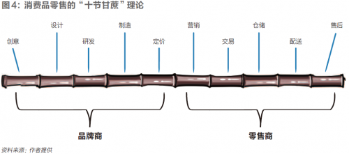 十年前,京东提出过一个“十节甘蔗”理论,把消费品零售的价值链分为创意、设计、研发、制造、定价、营销、交易、仓储、配送、售后等10个环节。其中,前5个环节归品牌商,后5个环节归零售商。