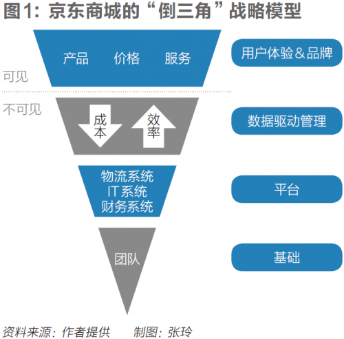 一直以来,京东笃信“成本、效率、体验”,我们这样定位京东的核心竞争力:前端用户体验,后端成本、效率。前端谁的客户体验更好、后端谁的成本更低,谁就有持续的竞争力。团队是基础层、根基层,上面一层是系统层,就是公司最核心的三个系统——IT系统、物流系统和财务系统,最上面就是用户(图1:京东商城的“倒三角”战略模型)。