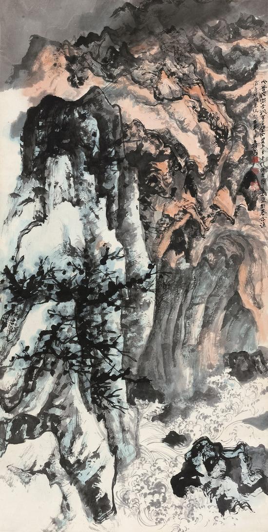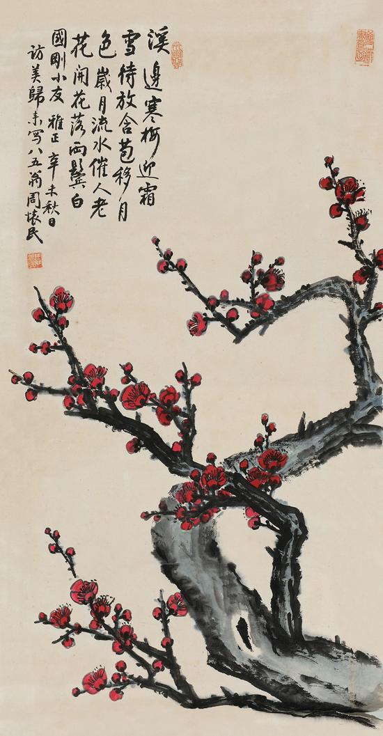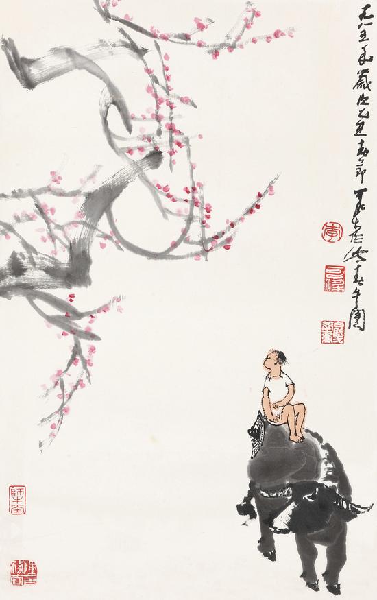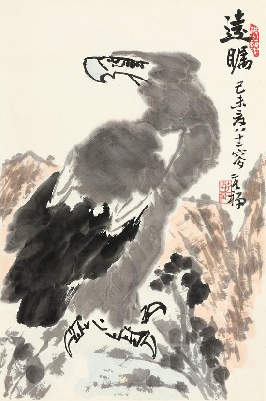 另外两件由现藏家分别得自艺术家本人的李可染《春牧图》和李苦禅《远瞻》,前者作于1985年,画牧童骑牛回望,桃花花开正酣,焦墨与晕染并用,苍劲浑厚中又不失活泼俏皮,为李氏晚年同题材之妙品。后者作于1979年,画苍鹰矗立山巅回望,以示“高瞻远瞩” 之美喻。画面苍鹰顶天立地,墨气酣畅,山石皴擦点染浑厚错落,整幅作品精雕细琢,墨色勾勒讲究,亦为李氏晚年同题材之翘楚。同场一件曾先后于香港翰墨轩《吴冠中鉴定特集》(1991年)、湖南美术出版社《吴冠中全集•卷五》(2007年)等多次权威出版的吴冠中师虚谷法《长寿》,也让藏家眼前一亮。