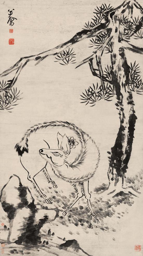原籍江西南昌的万承紫(1775-1837)是嘉道年间有名的收藏家,藏品中如赵孟頫《水仙图》等均是上上之选。万氏道光五年(1825年)改任中河通判,十三年任桃北同知,因治属淮安,于是以此为籍;至其四子万青选后来官淮安知府,是为周恩来外祖父。本次“壶中鸥波——士子和他的时代”专场即推出万承紫旧藏同乡八大山人《松鹿图》巨幅,当系万氏在南昌所得,携至淮安,后转入晚清大家章紫伯藏笥。此帧《松鹿图》绘一鹿立于虬松下回望,似远非单纯的俗家祝寿之意,实则是八大山人在清初社会的自我认知与皇族身份的隐密表达。