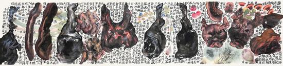 出版于《中国当代水墨艺术展》的《盛宴》,是李津同题材的大尺幅精品之作。画家将最受资深吃货欢迎的烤乳猪、烤全羊、烧鸡、酱鸭等肉食搬到了宣纸上,诙谐幽默、充满调侃情趣,又在空白处填以萝卜、白菜、樱桃等蔬果及文字,讽喻良深。