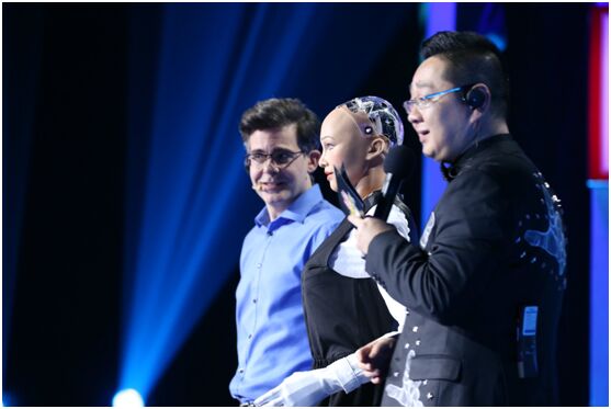 在现场,这位“美女”机器人也与各位“未来体验官”展开了畅聊。她先是亲切的称呼主持人张绍刚为“刚”,;随后当主持人要求她与体验官量化派创始人周灏一起做“吃了芥末还要表现出很开心”的复杂表情时,Sophia竟然瞬间和周灏做出了相似度90%的生动表情,令周灏大吃一惊。