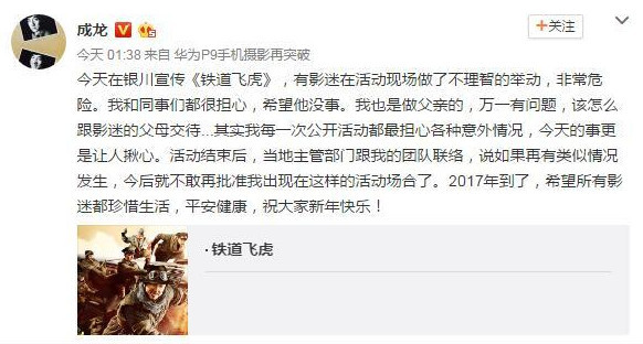 腾讯娱乐讯 2017年1月1日,正在银川宣传自己新电影《铁道飞虎》的影星成龙遭遇粉丝的不理智举动,发微博呼吁粉丝理智追星,注意安全,并希望所有影迷都珍惜生活,平安健康。成龙在微博写到“有影迷在活动现场做了不理智的举动,非常危险。我和同事们都很担心,希望他没事。”