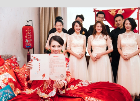 10月5日一早,张效诚便带着备好的彩礼,领着帅气的伴郎团向吴敏霞家出发。而在新娘家中,衣佩妆成的吴敏霞和穿着定制晨袍的伴娘团正坐在婚床上,等待新郎官来把佳人接,一起去迎接自己最重要的一天。