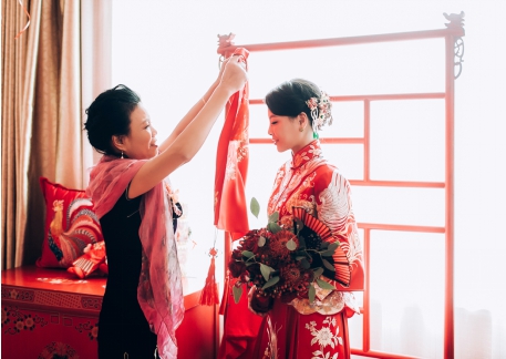 求婚当天,张效诚曾动情地向吴敏霞告白:“五月,我们缘定今生;十月,你将是我最美的新娘。”事实证明,他没有食言。在今天这场地地道道的中式婚礼里,吴敏霞当真成了披着凤冠霞帔,等着如意郎君脚踏七彩祥云来迎娶的“紫霞仙子”。