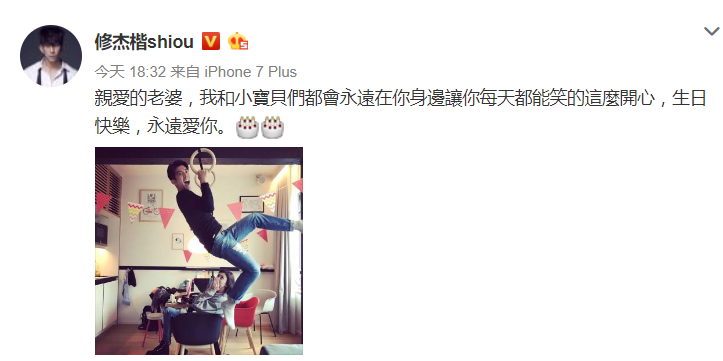 新浪娱乐讯 艺人贾静雯与修杰楷结婚后,陆续迎来咘咘、Bo妞两个女儿,两人也是演艺圈中出了名的恩爱夫妻。贾静雯7日迎来43岁生日,宠妻的修杰楷在工作之余,也不忘为老婆安排惊喜,还在微博上告白,“永远爱你”,闪瞎众人。