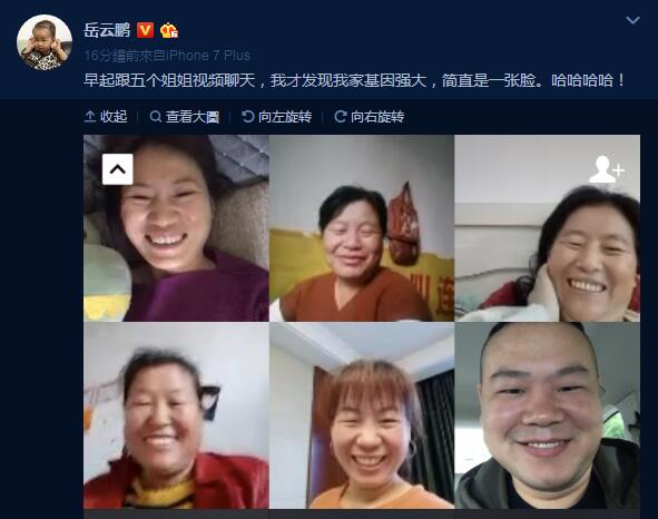 凤凰网娱乐讯(文/叶子) 10月20日上午,岳云鹏在微博晒出一组和姐姐们视频聊天的截图,并大呼“早起跟五个姐姐视频聊天,我才发现我家基因强大,简直是一张脸。哈哈哈哈!”