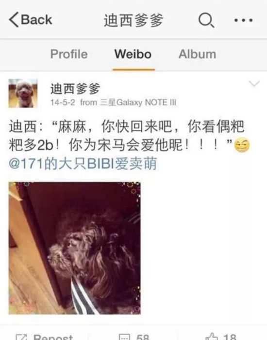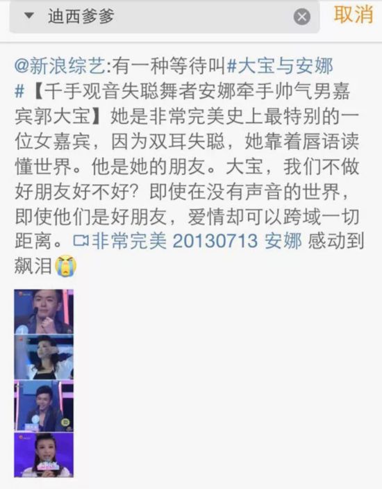 你以为剧情到这里就完结了?nono,迪西爹爹也只是个小号而已,真正的大号名叫“郭大宝Allen”,郭大宝的正牌女友叫安娜,是一名失聪舞者,围脖名“朱安娜_mango”,小编觉得人生观变得好混乱……