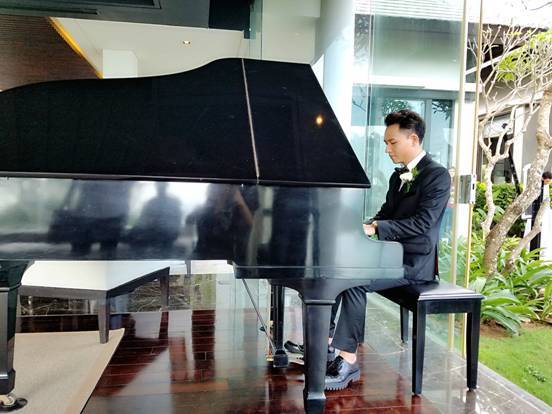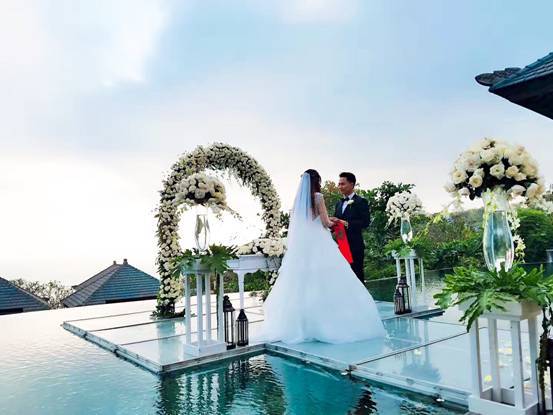 今日,一组欢子巴厘岛大婚现场照片首度曝光。婚礼于某酒店别墅举行,欢子携父母及双方家人出席,场面温馨。现场布置以白色为主色调,鲜花布满,简约中又显高贵大方,加上天工造美天气阳光普照,情景相当浪漫。水岸边,欢子于新娘刘璐执手相看,互念誓词,爱意藏不住。