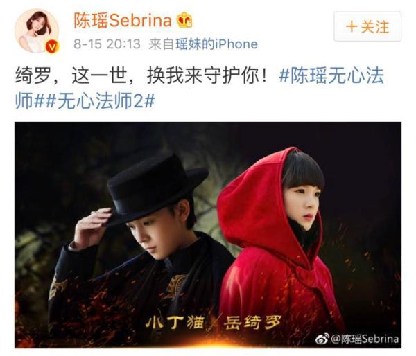 陈瑶微博上展示其出演的小丁猫与岳绮罗两个角色。