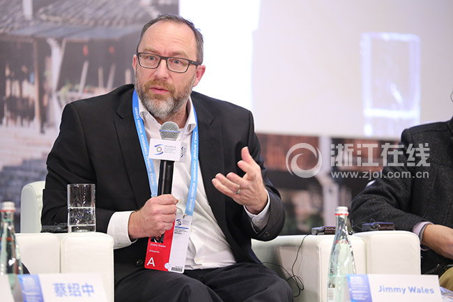 维基百科创始人吉米·威尔士参加论坛对话。浙江在线记者王坚颖摄