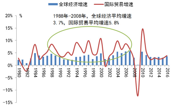 在2008年全球金融危机爆发前,全球贸易增长速度一直维持在两倍或者两倍以上的增长速度。但是,危机之后,全球贸易增长乏力,速度开始回落。数据显示,到2011年,全球贸易的增长速度和全球GDP增速持平,到2014年,国际贸易的增长速度已经开始出现低于全球GDP的增速的情况。WTO最近发布的《世界贸易统计数据》显示,2015年全球贸易总量缓慢增长2.7%,与全球GDP增速(2.4%)基本持平,同时预测2016年全球贸易增速将与去年持平,也将是全球贸易增速连续第五年低于3%。