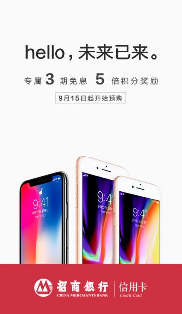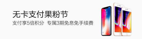 招商银行信用卡曾与苹果展开多次合作,且每次合作均以独家或首发身份出现。在本次推出的“无卡支付果粉节”活动中,持卡人只需使用招商银行信用卡,通过掌上商城或苹果官网专区,以网上分期的方式购机(包括iPhone X、iPhone 8、iPhone 8 Plus、Apple watch、Apple TV等新品),就可享受独家3期免息及招商银行信用卡5倍积分;以招商银行网银支付、支付宝、微信支付、VISA、Master等“无卡支付”的方式购机,亦可同享招商银行信用卡5倍积分。此外,持卡人使用招商银行信用卡绑定Apple Pay交易,或通过“绑定银联卡支付”渠道绑定招商银行信用卡进行iTunes支付,可享受招商银行信用卡5倍积分福利。