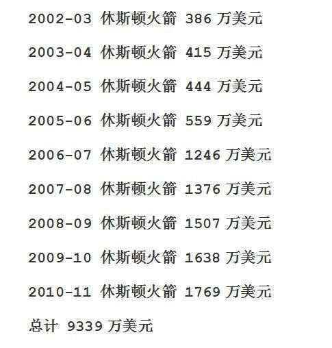 姚明在2002年以状元秀的身份进入NBA火箭队打球,拥有极高篮球天赋和篮球智商的他,通过不断的努力,慢慢成长为一名篮球巨星,再加上他给火箭队带来的中国市场,老板给他的工资肯定是不低的。姚明在火箭打了9个赛季,一共获得了9339万美元的薪水。