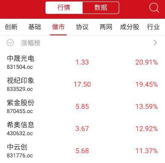 做市转让方面,中晟光电涨幅20.91%,领涨做市个股,此外,视纪印象、紫金股份、希奥信息等涨幅居前;掌上通、汇龙科技、金瑞科技、天秦装备等跌幅居前。