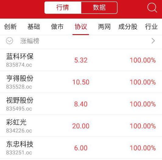 协议转让方面,蓝天环保、亨得股份等8股涨幅100%,领涨协议个股;京鹏科技、航星股份等10股跌幅50%。