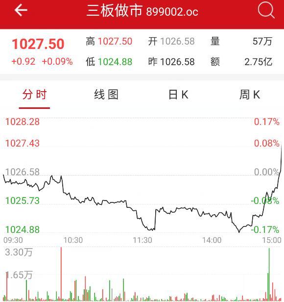 截至收盘,三板做市指数报1027.50点,跌0.92点,跌幅0.09%,成交额2.75亿元。