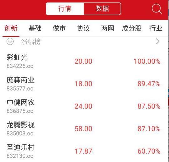 创新层方面,彩虹光等涨100%,领涨创新层个股,此外,庞森商业、中健网农等涨幅居前;博广环保、菁茂农业、嘉盈科技等跌幅居前。