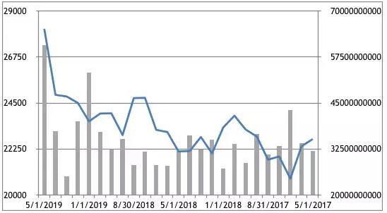 今年呢?2017年8月份峰值较过去一年的成交量仅仅上涨了36.49%,如果用第二高的3月份数据做对比,那么成交量仅仅增加了19.03%。